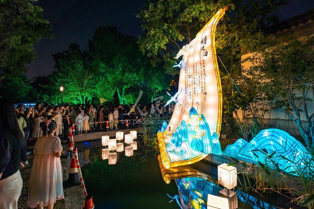 2023年9月29日晚,江苏省苏州工业园区,市民游客在斜塘老街观赏《将进酒》灯组。