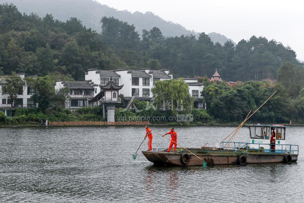 2023年9月30日,在安徽省黄山市屯溪区,保洁员在新安江江面上打捞漂浮物。