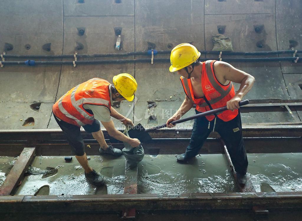 上传时间: 2023-09-30 18:03:36 图片说明: 9月30日,建设工人在浙江省宁波市轨道交通土建TJ7025标清理坑道中积水。