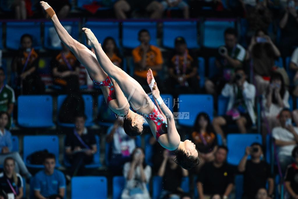 2023年9月30日晚,在杭州亚运会进行的女子双人10米台决赛中,中国选手全红婵/陈芋汐进行比赛。