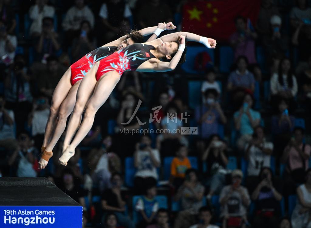 2023年9月30日晚,在杭州亚运会进行的女子双人10米台决赛中,中国选手全红婵/陈芋汐进行比赛。