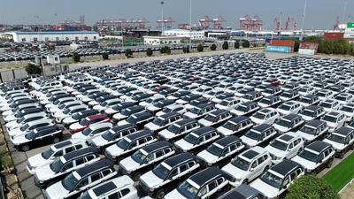 2023年10月18日,江苏省苏州港太仓港区国际集装箱码头,一批新能源汽车整装待发销往市场。