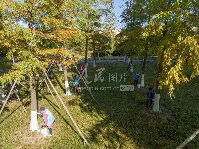 2023年11月6日,江苏省连云港市东海县,园林部门组织园林工人对城区主次干道、公园广场绿化树木进行“涂白”,既提高树木抗寒能力,又美化城市环境。