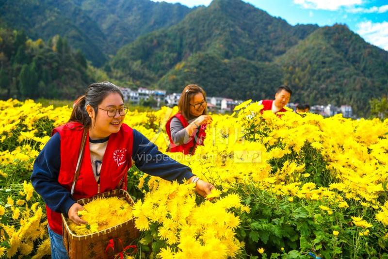 2023年11月7日,浙江省杭州市淳安县姜家镇赤城村村民与姜家镇青年党员志愿者一起在金丝贡菊基地采摘菊花。