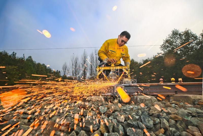 2023年11月8日,南阳工务段焊补员工对新轨进行焊接焊补精细打磨。