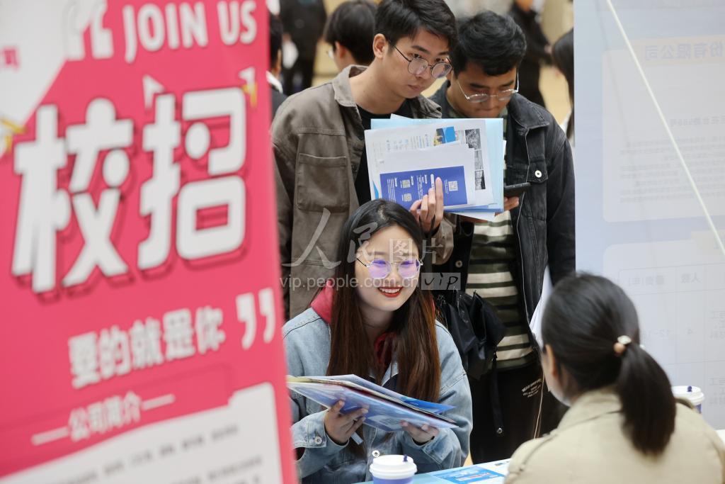 2023年11月10日,在浙江工业大学莫干山校区内,求职者在校园专场招聘会上与企业招聘人员交流。