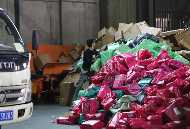 2023年11月13日,在浙江省台州市路桥区螺洋街道一家快递网点,工作人员忙着分拣投运。“双11”过后,快递迎来一次寄递高峰,在台州市路桥区,各家寄递网点加班加点,确保第一时间完成分拣、寄送。
