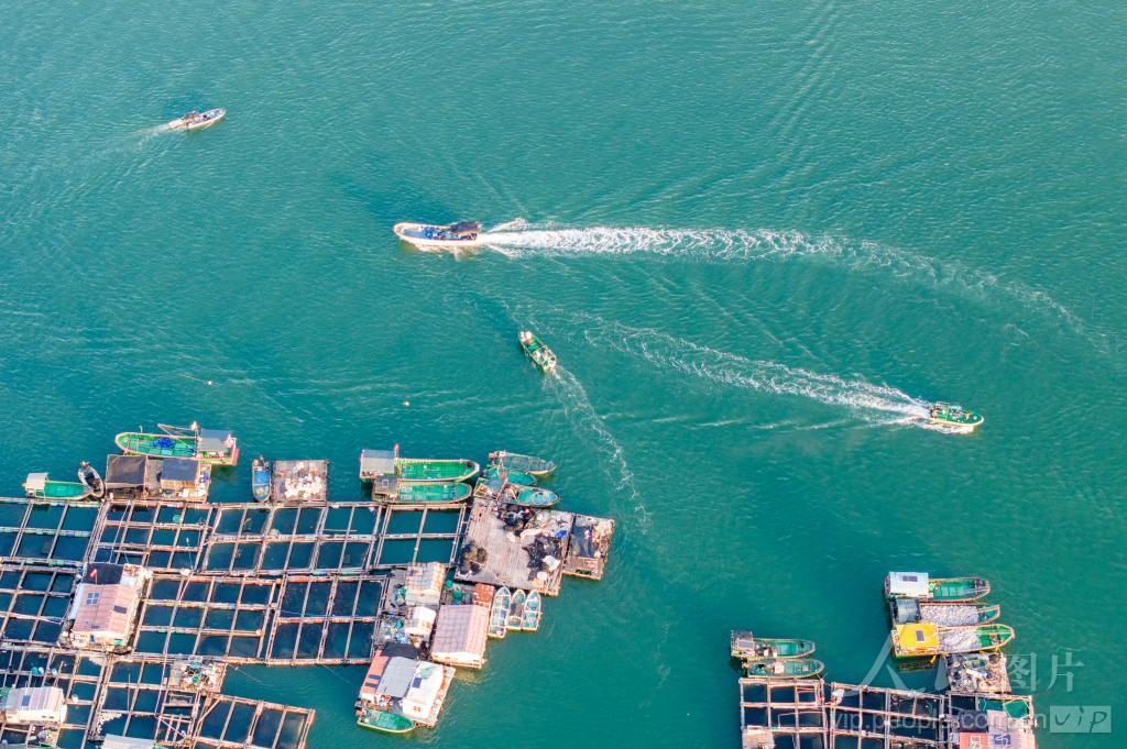 2023年11月18日,海南省陵水县新村镇新村渔港,航拍疍家渔排海上养殖基地,星罗棋布的海上人家、进出渔排的渔船与湛蓝的大海相映成趣,美轮美奂。