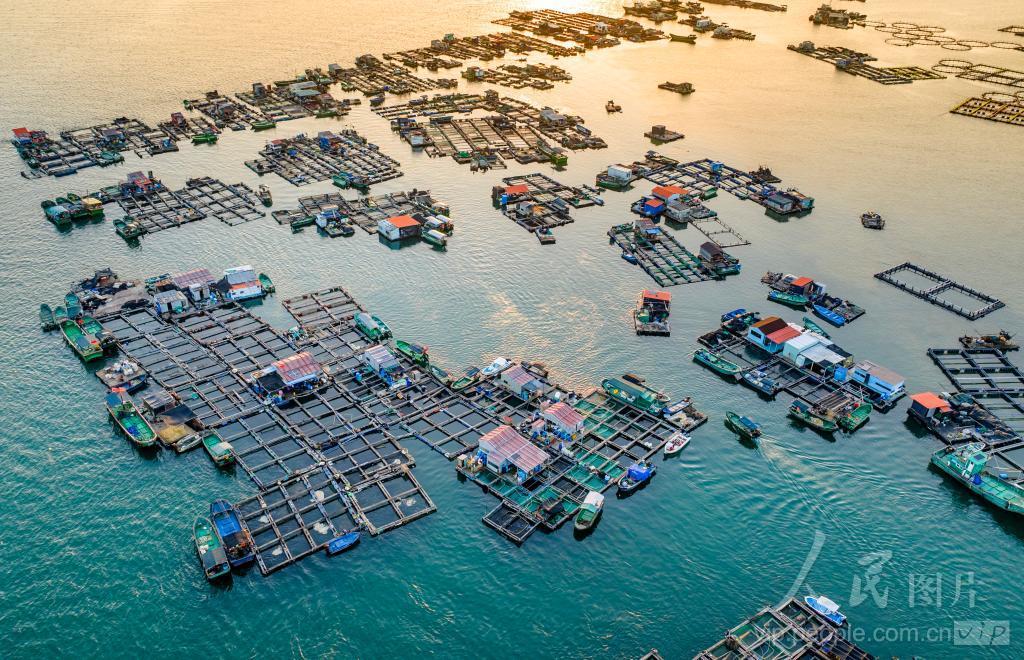 2023年11月18日,海南省陵水县新村镇新村渔港,航拍疍家渔排海上养殖基地,星罗棋布的海上人家、进出渔排的渔船与湛蓝的大海相映成趣,美轮美奂。