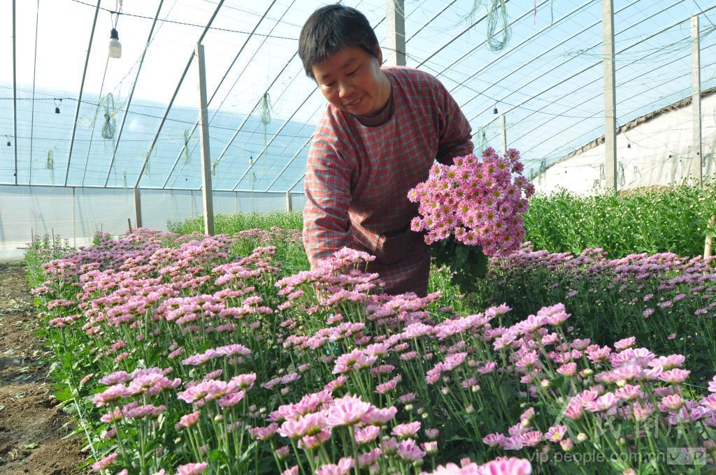 2023年11月21日,江苏省连云港市东海县双店镇三铺村花农正在采收彩球小菊花。