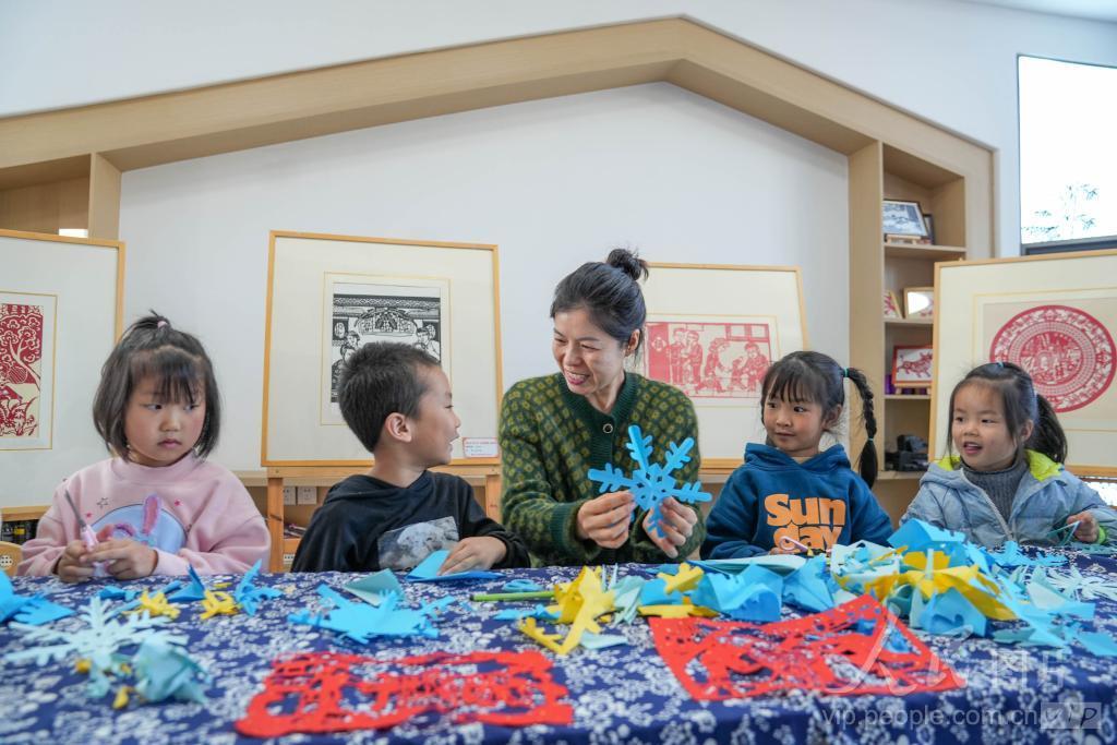 11月21日,浙江省湖州市长兴县李家巷镇中心幼儿园内,小朋友们正在老师的讲解下创作雪花剪纸。