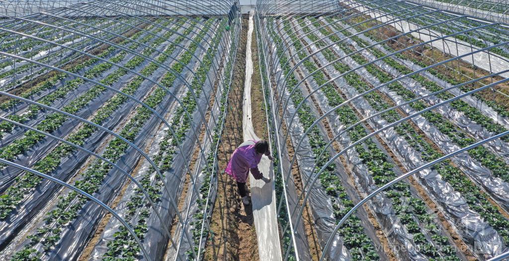 2023年11月21日,浙江省台州市仙居县下各镇农民忙着在给草莓大棚覆盖塑料薄膜,做好防冻御寒等工作。
