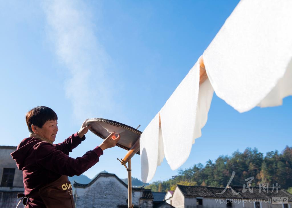 2023年11月21日,浙江省浦江县虞宅乡新光村村民趁着晴好天气,忙着晾晒当地特产米粉面。