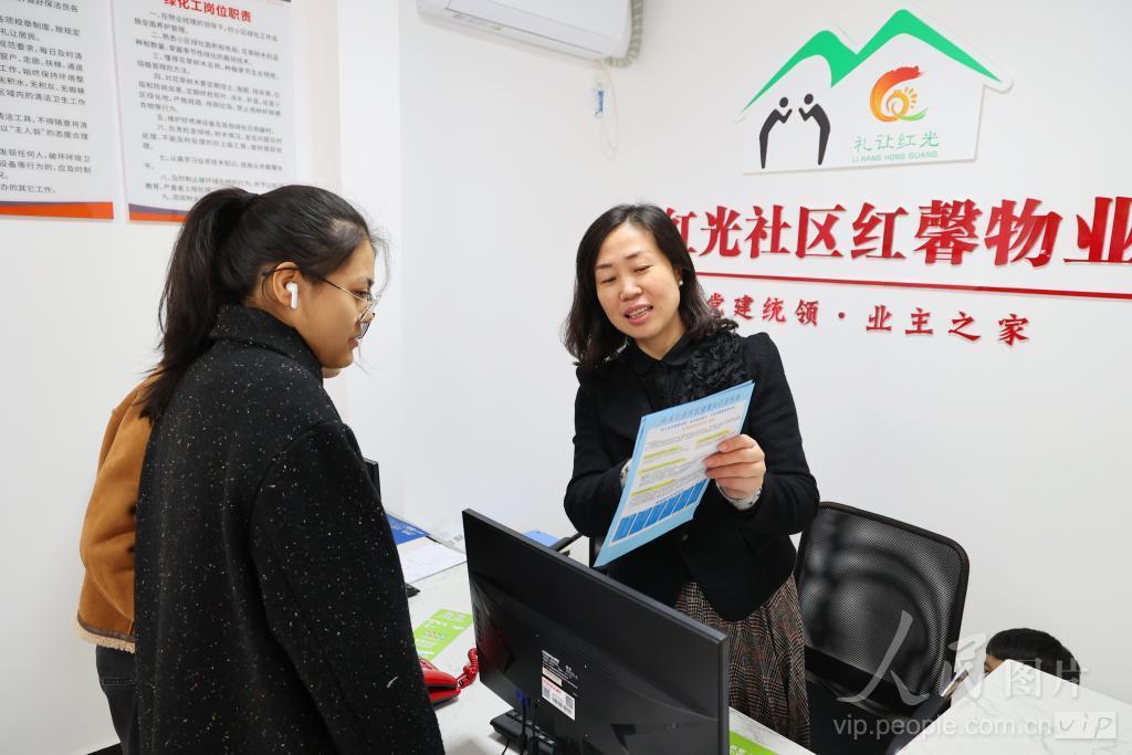 2023年11月18日,重庆市垫江县桂溪街道红光社区的桂北小区红馨物业服务中心,物业工作人员向前来咨询的居民解答相关问题。桂北小区原为桂北安置房,建于2014年,有220户居民、门市112个,是典型的无物业管理、无主管部门、无人防物防的“三无”小区。 桂溪街道坚持党建统领、数字赋能,以红光社区为中心,联合9个社区成立“红色物业”联合党委,创办全县首家社区物业公司—重庆市垫江县红馨物业管理服务有限责任公司。物业围绕保清洁、保维修、保绿化、保安全等“十保”物业服务指南提供兜底性物业服务,每月每平方米/0.38元的物业管理费让居民交口称赞。物业公司工作人员均从社区热心居民、低收入居民中招聘,既帮助低收入群体在“家门口就业”,又最大程度地降低运营成本。同时,红馨物业公司开办家政服务、快递驿站等增收项目,实现收支平衡略有结余,推动可持续发展。目前,红馨物业公司累计接管“三无小区”18个,着力破解“三无小区”治理难题。