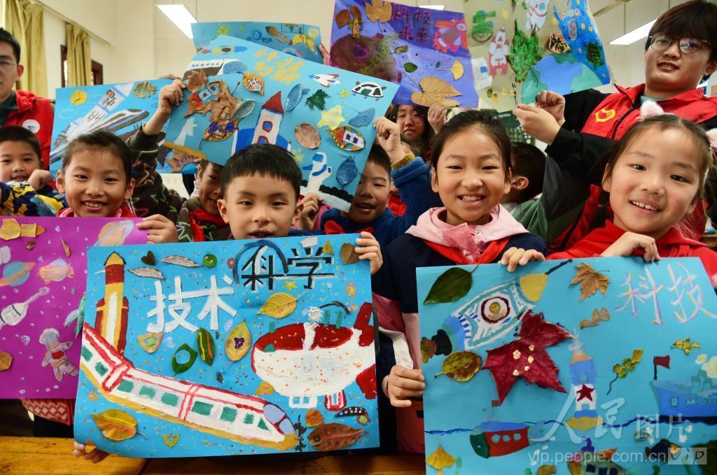 2023年11月22日,在江苏省镇江市朱方路小学,江苏科技大学志愿者和小学生一起展示用落叶贴绘的科普创意画。