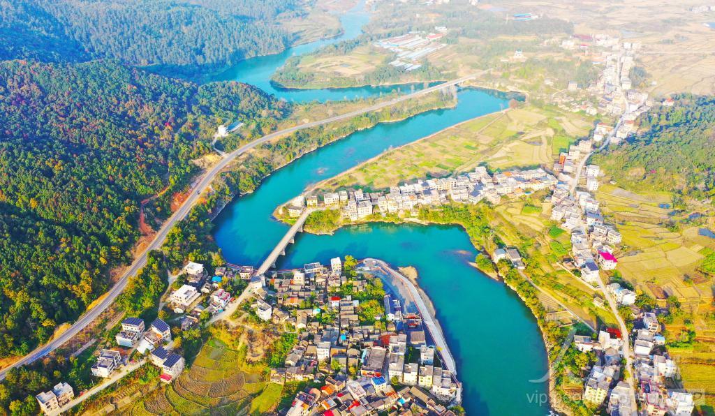 2023年11月24日,湖南省永州市新田县新隆镇佃湾村山林色彩斑斓,舂陵河清澈如玉,畅通的国道G234与村庄、田园相互映衬,构成了一幅水清、路畅、岸绿、景美的初冬乡村画卷。