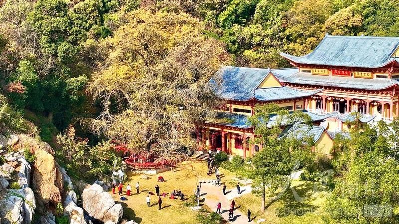 初冬时节,在安徽省芜湖市三山区峨桥镇石谷村铜山寺前,一棵千年银杏树的叶子全部变黄,吸引不少游客前来观赏。