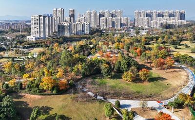 2023年11月27日,江西省萍乡市翠湖公园多彩的树木在暖阳的映衬下,五彩斑斓,冬景如画。