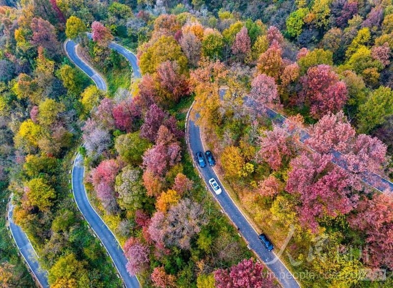 2023年11月29日,穿行在湖北省安陆市王义贞镇钱冲村五彩斑斓盘山公路上的车辆。