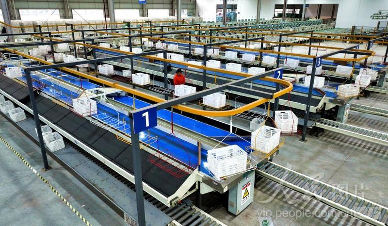 2023年12月1日,在四川省眉山市仁寿县富加镇川果智慧冷链物流中心分拣车间,工作人员正在分选线上工作。