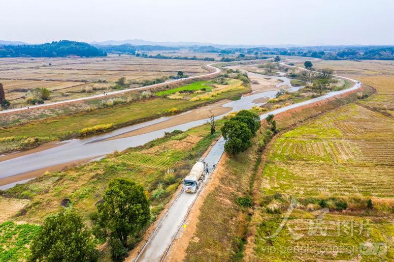 2023年11月30日,工人在江西省宜春市奉新县赤岸镇黄沙港堤应急通道改造项目现场加紧施工。