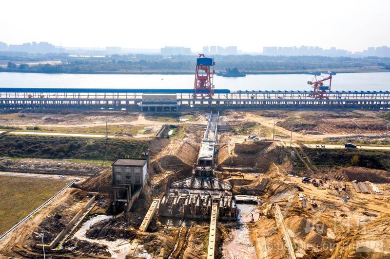 2023年12月1日,工人在江西省宜春市樟树市赣西肖江堤涝区排涝能力建设项目一期贮木场电排站建设现场加紧施工。