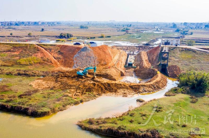 2023年12月1日,工人在江西省宜春市樟树市赣西肖江堤涝区排涝能力建设项目二期长塘电排站建设现场加紧施工。