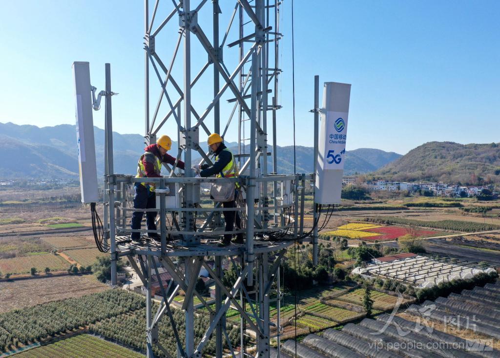 2023年12月1日,在安徽省铜陵市义安区钟鸣镇金榔村,安徽移动铜陵分公司技术人员在进行5G基站设备更新升级。