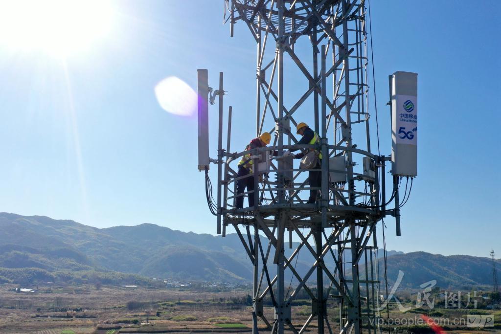2023年12月1日,在安徽省铜陵市义安区钟鸣镇金榔村,安徽移动铜陵分公司技术人员在进行5G基站设备更新升级。