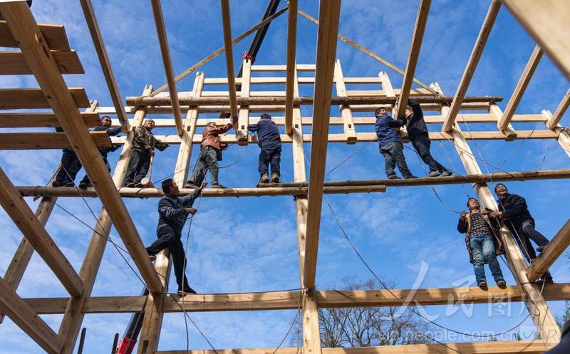 2023年12月3日,木匠在湖北省鹤峰县燕子镇新行村修建吊脚楼。