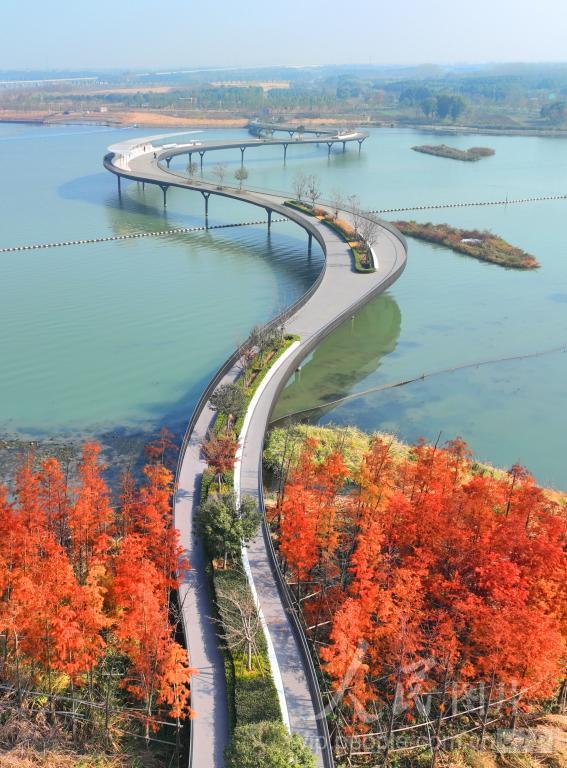 元荡慢行桥总长585.7米,宛若一条随风飘动的彩缎飞卧在元荡湖上。作为示范区内首座大型景观步行桥,不仅连接着上海青浦和江苏吴江,还将元荡湖两岸的湿地景观和环湖绿道对接,串联起周边丰富的生态旅游资源和人文资源,成为两地市民休闲漫步的好去处。