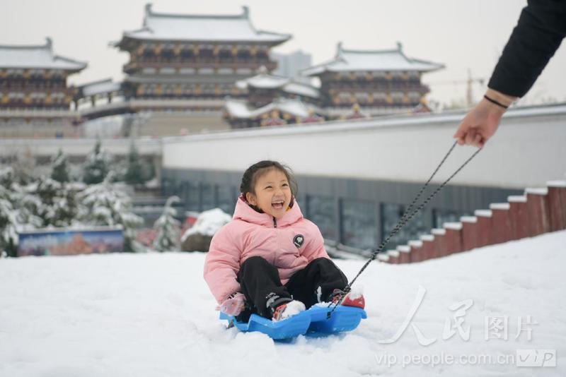 2023年12月11日,在河南省洛阳市一游园内,市民在雪地里玩雪。 12月10日晚,河南洛阳迎来2023年入冬后首场降雪。雪后的洛阳美丽如画,隋唐洛阳城应天门博物馆和天堂明堂景点在雪的装扮下格外美丽。