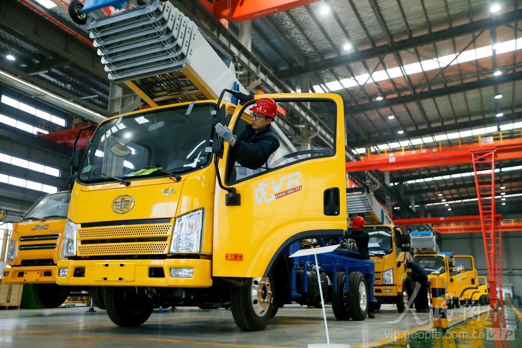 2023年12月14日,位于山东省青岛市即墨区的青岛九合重工机械有限公司的员工在调试出口到海外市场的云梯车。