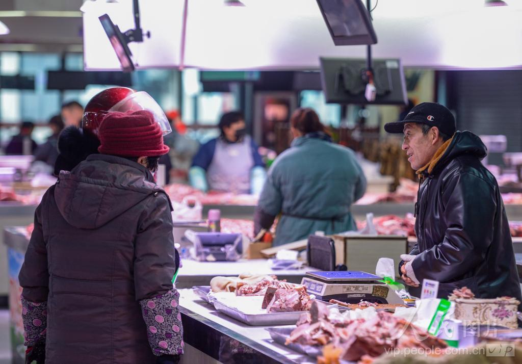 12月15日,在江苏宿迁市区西楚农贸市场,市民正在选购蔬菜、水果和肉类产品。 近日,寒潮来临,宿迁气温骤降。市区各大超市、菜市场等地加强货源组织,增加市场储备,全力保障市民“菜篮子”供给。