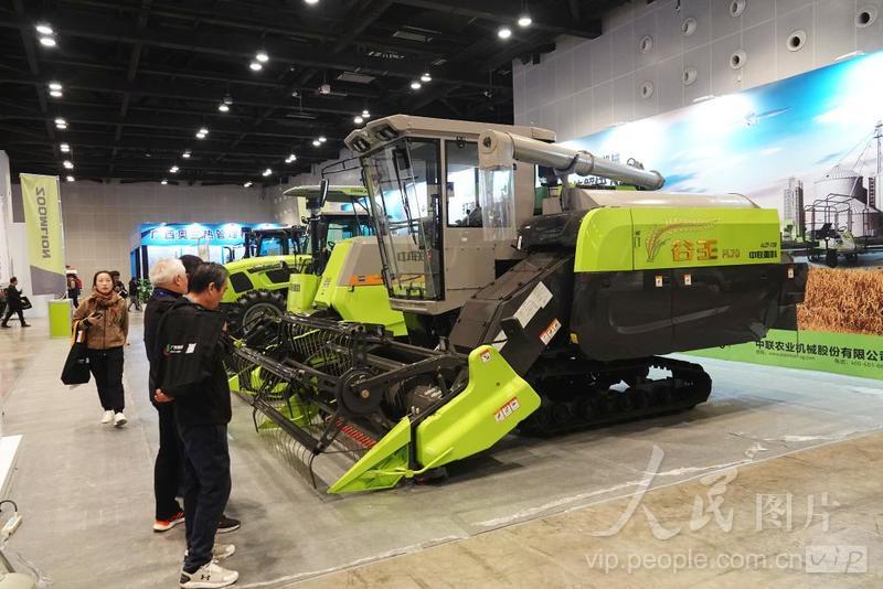 2023年12月16日,专业观众在参观展出的水稻收割机。