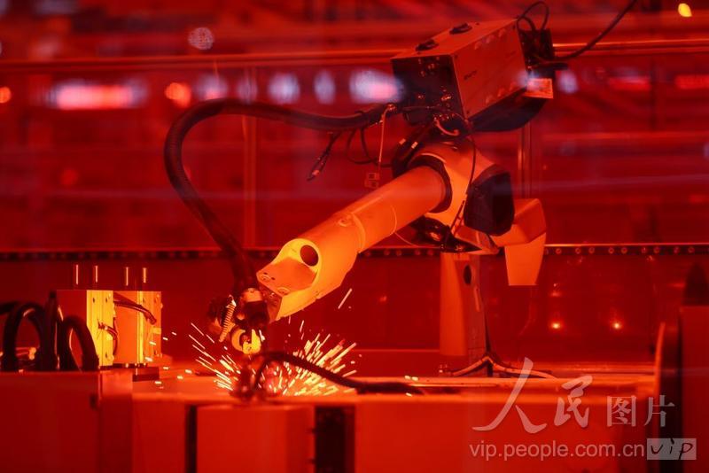 2023年12月18日,位于浙江省湖州市德清县雷甸镇(高新区临杭产业新区)的浙江鼎力机械股份有限公司生产车间,工业机器人在焊接车间流水线上作业。