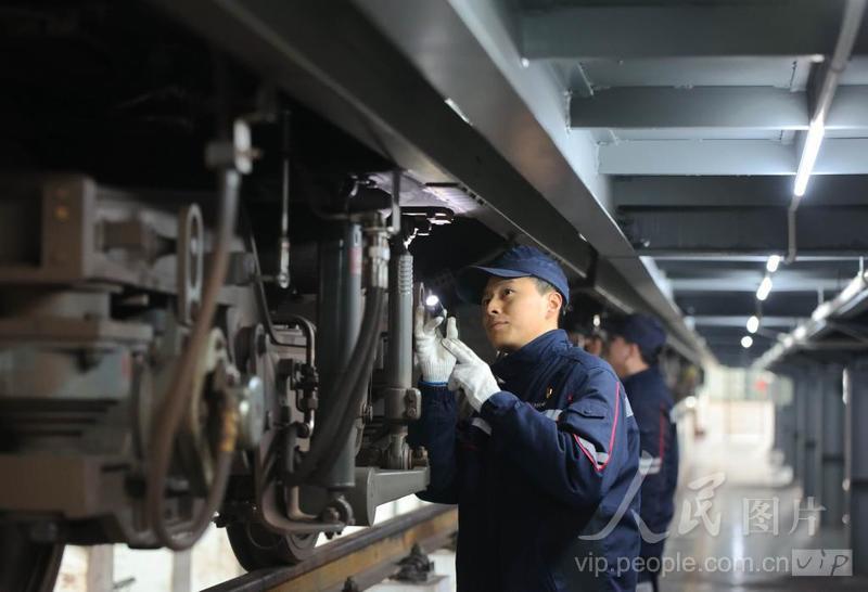 2023年12月19日,安徽省合肥市轨道交通3号线新站高新区磨店车辆段运用库,工程师对轨道交通列车进行检查养护。