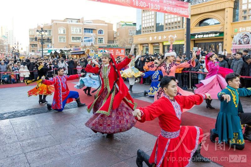 上传时间: 2024-01-01 23:27:25 图片说明: 2024年1月1日,在新疆国际大巴扎景区,演员为游客表演舞蹈。