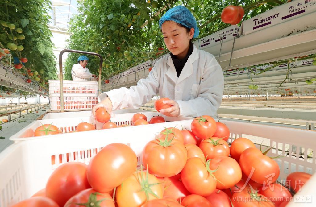 2024年1月5日,浙江省湖州市德清县阜溪街道龙胜村水木蔬菜工厂智能温室内,工人在采收番茄。眼下,德清县在保障本地菜篮子供应的基础上,还积极组织各类蔬菜运往外地,以满足春节市场的供应需求。