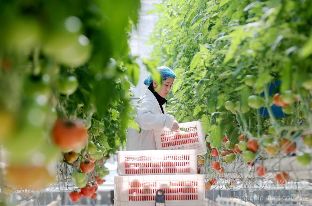 2024年1月5日,浙江省湖州市德清县阜溪街道龙胜村水木蔬菜工厂智能温室内,工人在采收番茄。眼下,德清县在保障本地菜篮子供应的基础上,还积极组织各类蔬菜运往外地,以满足春节市场的供应需求。