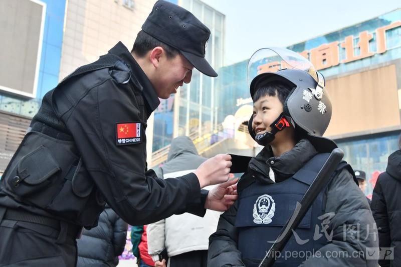 2024年1月8日,在河北省邯郸市永年区警民互动活动上,一名小朋友正在体验警用装备。