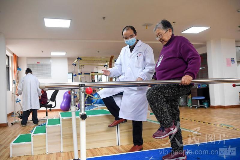 2024年1月9日,江西省宜春市袁州区熟年护理院的医护人员在陪着老人做康复训练。