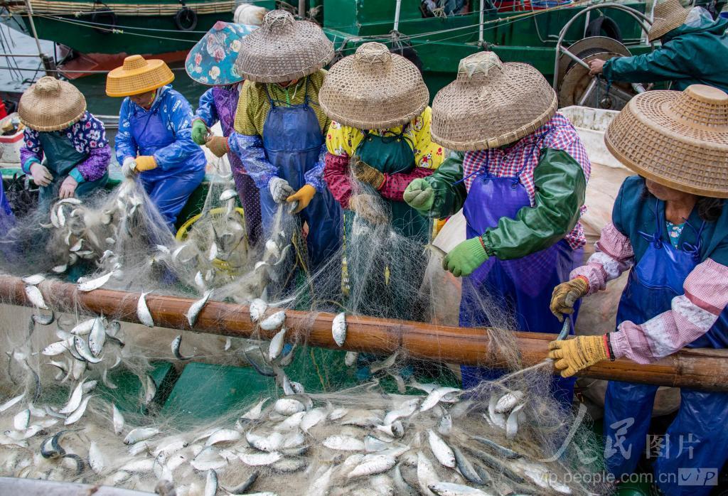 2024年1月8日,湛江市徐闻县雷州半岛外罗港码头,出海捕捞归来的渔船停靠码头,妇女拆网取鱼,一片繁忙景象。