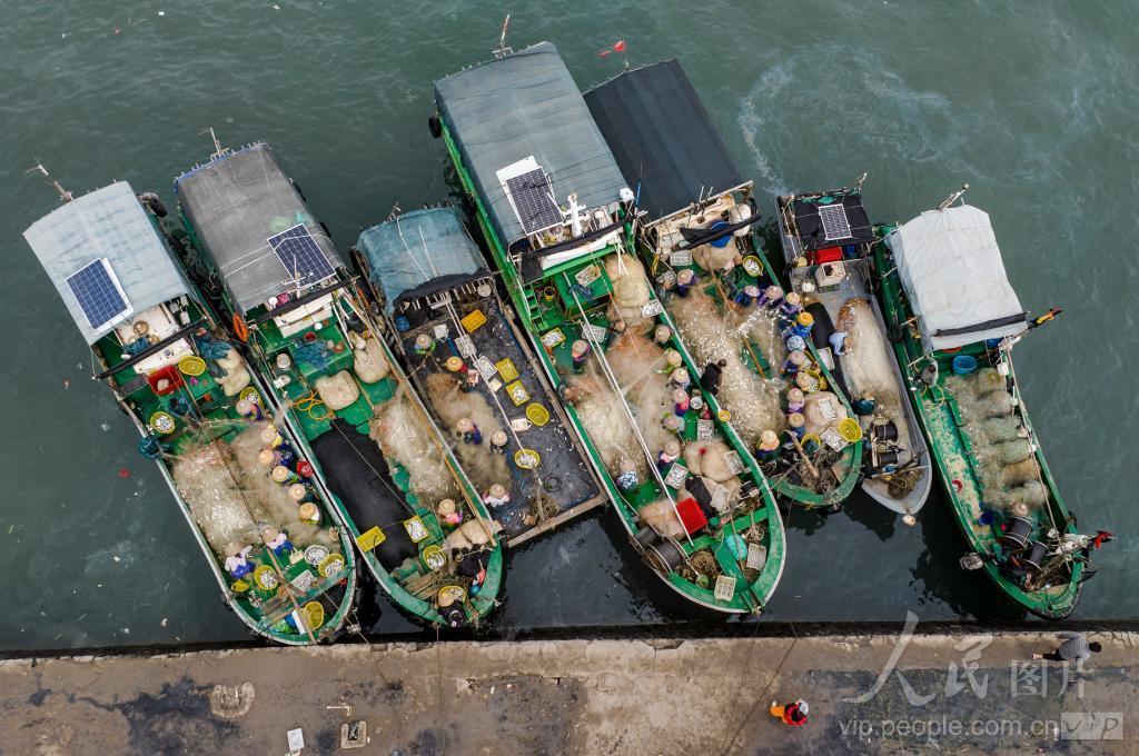 2024年1月8日,湛江市徐闻县雷州半岛外罗港码头,出海捕捞归来的渔船停靠码头,拆网取鱼,一片繁忙景象。