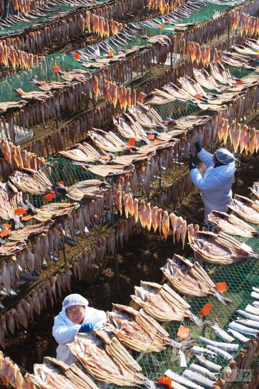 2024年1月12日,在山东省荣成市王连街道北桥头村一渔家小院,村民抓紧时间晾晒鱼干,供应市场。 目前,正是晾晒鱼干的好时节,荣成沿海许多人家忙着晾晒鱼干供应即将临近的节日市场。近年来,当地渔民通过各种电商平台将回水咸鱼干制品销往各地市场,供不应求,增加了收入,也发展成为乡村振兴新产业。