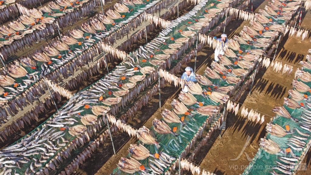 2024年1月12日,在山东省荣成市王连街道北桥头村一渔家小院,村民抓紧时间晾晒鱼干,供应市场。 目前,正是晾晒鱼干的好时节,荣成沿海许多人家忙着晾晒鱼干供应即将临近的节日市场。近年来,当地渔民通过各种电商平台将回水咸鱼干制品销往各地市场,供不应求,增加了收入,也发展成为乡村振兴新产业。