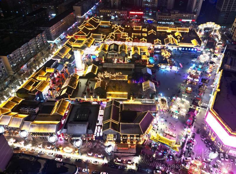2024年1月13日,夜幕降临,华灯初上,空中俯瞰辽宁省沈阳市老北市景区,璀璨的灯光和特色古建筑交织出美轮美奂的迷人景色,拉满“年味儿”氛围。