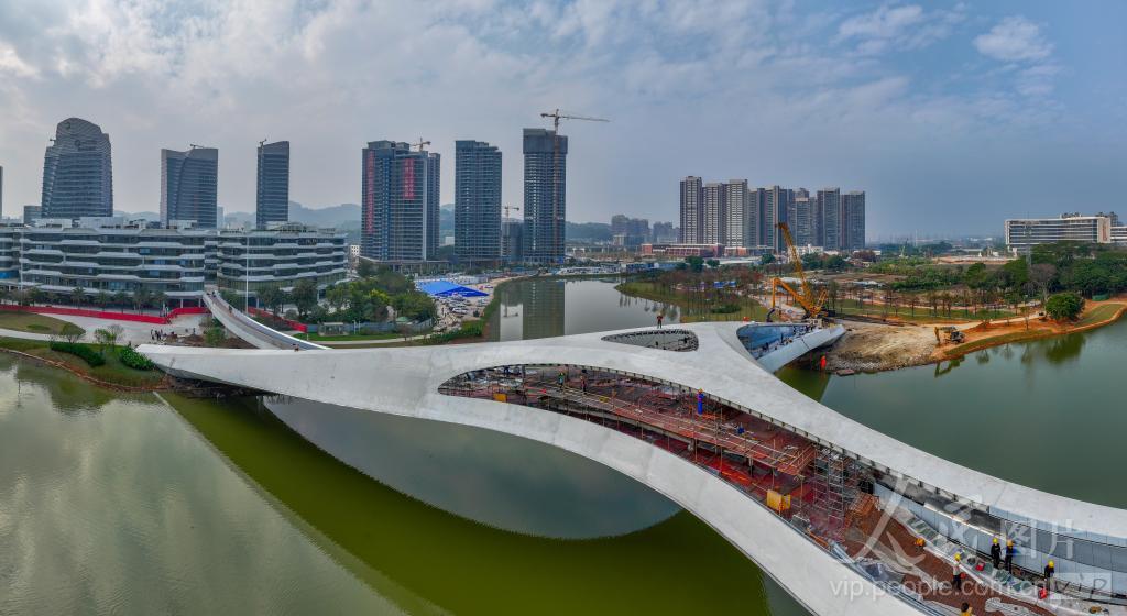 连日来,位于广东省广州市南沙区的人行景观桥聚星桥正在进行最后的收尾作业。聚星桥是国内首座三肢星型人行景观桥,造型新颖独特,三岸起拱相互支撑成桥,寓意粤港澳三地携手,汇聚同心,共创大湾区美好未来。图为工人们在桥上施工。