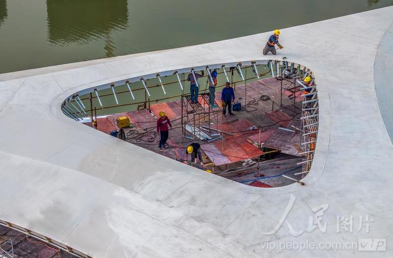 连日来,位于广东省广州市南沙区的人行景观桥聚星桥正在进行最后的收尾作业。聚星桥是国内首座三肢星型人行景观桥,造型新颖独特,三岸起拱相互支撑成桥,寓意粤港澳三地携手,汇聚同心,共创大湾区美好未来。图为工人们在桥上施工。