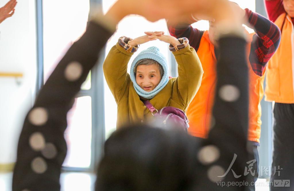 2024年1月16日,江西省抚州市南丰县养老康复中心的工作人员在和老人一起跳舞。